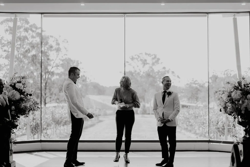 I also love emceeing at wedding receptions ... which means you don’t have to trouble anyone else to do it … and let’s face it, once your hilarious cousin Betsy has had a few drinks she isn’t going to be following the run sheet. As your emcee I work with all your suppliers to make sure the whole reception runs smoothly and everyone (caterer, venue, photographer, videographer, Cousin Betsy) is happy. So you guys can just chill and enjoy the day.