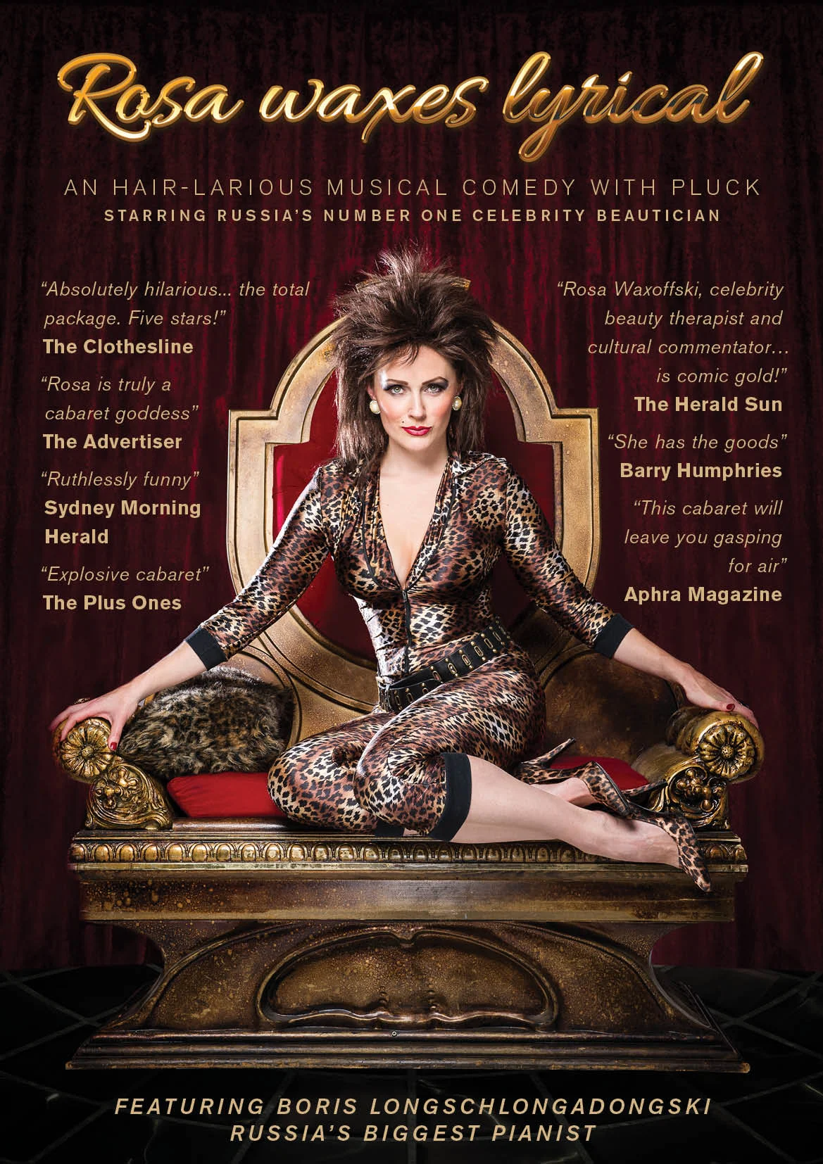 Marney McQueen stars as Celebrity Bikini Waxer ROSA WAXOFFSKI, who can guarantee the full body experience in ROSA WAXES LYRICAL. Her comedy cabaret performance will delight audiences as she takes you on a prickly journey which details her childhood in Leningrad, spills the sequins from the pages of her high profile celebrity appointment book and shares with you the very latest in bikini waxing fashion. Something else to get excited about is the special guest appearance from Russia’s Biggest Pianist, Boris Longschlongadongski. A 70 minute show which can adapt to a huge variety of venues.